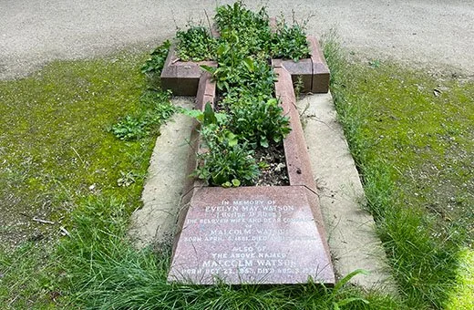 How this grave, with a cruciform kerb of red granite with a sloping engraved foot stone, orientated east-west, came to be sited so near the Chapel is unknown. Research of the records at Hackney Archives has not revealed any definitive information, apart from the undertakers name and that of Underwood and Son, the stonemasons. Further investigation is to follow.